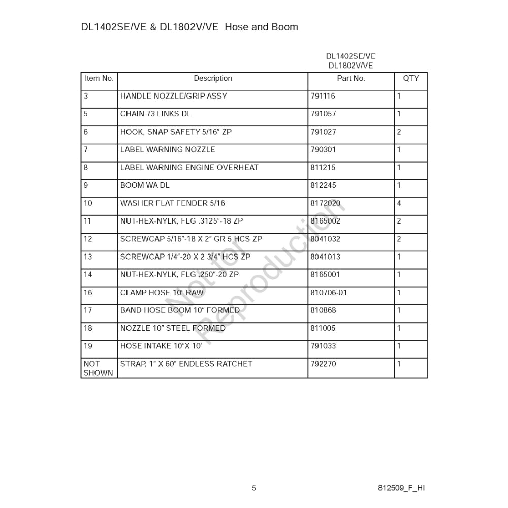 Parts Diagram - DL1402SE/VE, DL1802V/VE Hose and Boom